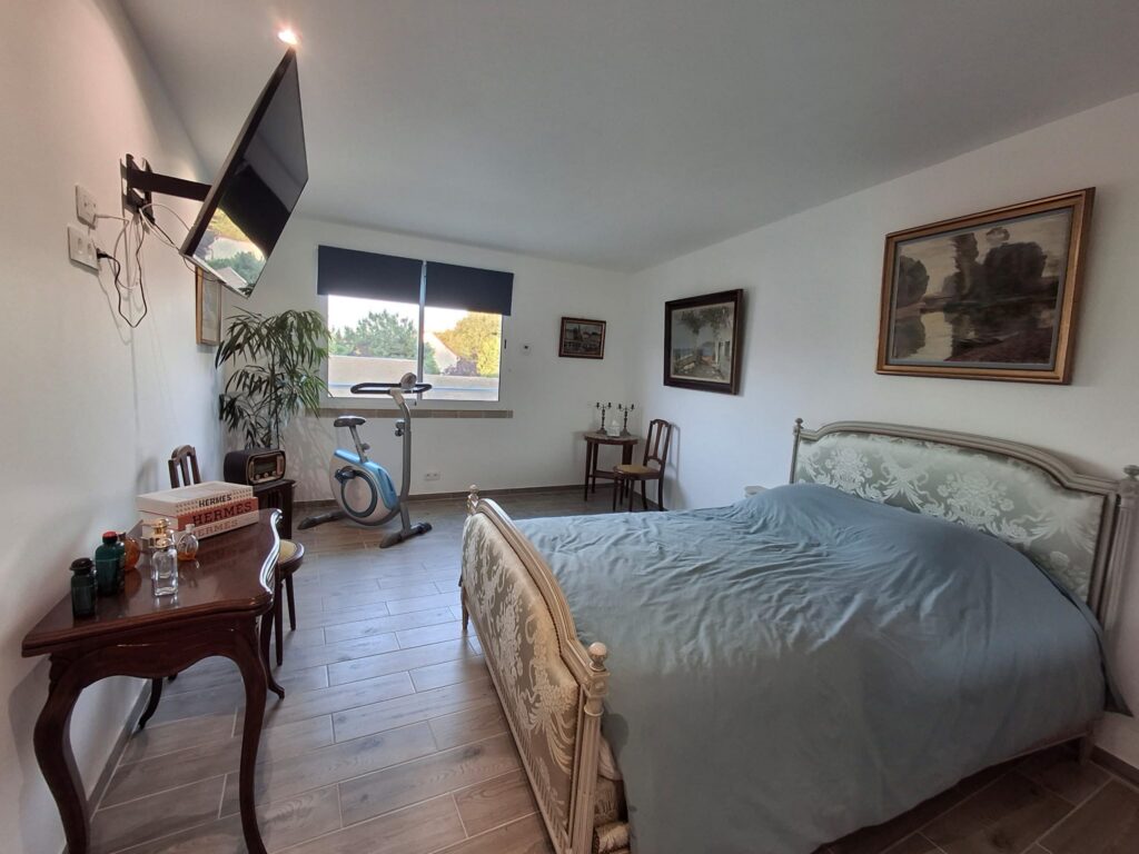 Belle chambre de 20 m2 avec lit 140×200, armoire et grande TV à écran plat; Salle de douche, vasque et WC séparé