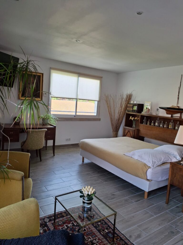 Grande chambre de 33 m2 avec lit 150×200, salon, armoire et grande TV à écran plat; Salle de douche, vasque et WC séparé